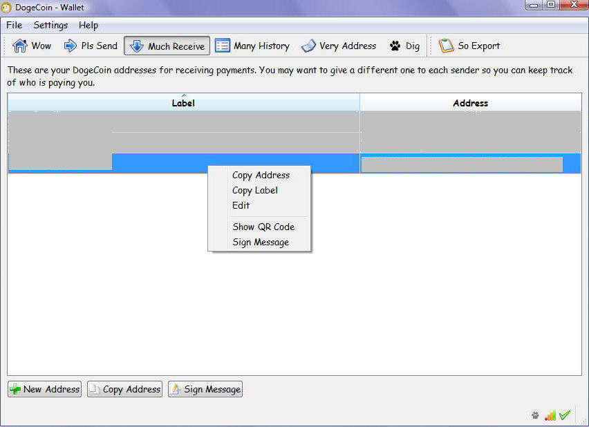 When you buy doge coins you need to provide a Dogecoin address to the seller. You generate an address by selecting ‘Much Receive’, and then ‘New Address’. Fill in a label to help you identify the transaction, and an address will be automatically created. Then right click on it and select ‘copy address’.