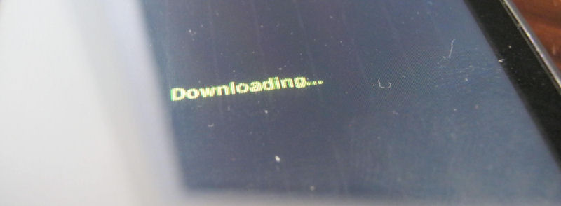 - Put the phone into download mode by pressing the ‘power’, ‘home’ (bottom middle) and ‘volume down’ buttons at the same time until the ‘Downloading…’ message appears on the phone’s screen.