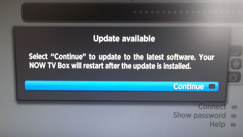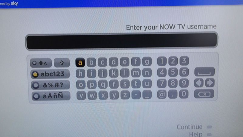 Straight away the box wakes up, and quickly it prompted me to provide details for my WiFi network. It showed a huge list of local networks, but my network is hidden, and it provided me with the option to manually type in the details using the remote control. Once I was connected to the network, I was prompted to sign-in with my NowTV details and it checked for updates (or vice versa).