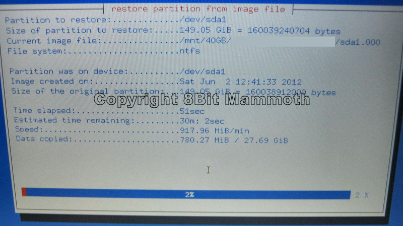 Note: If you’ve experienced the same problem that I did, a lot depends of the size of partition you are trying to restore. Luckily I had a spare 200GB hard drive available, which was larger that the partition I was having problems restoring.